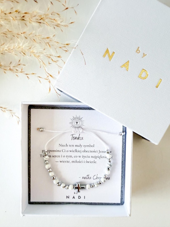 Delikatna bransoletka komunijna wykonana ręcznie z naturalnych kamieni. Symboliczna pamiątka Pierwszej Komunii Świętej jak i Bierzmowania z możliwością personalizacji dedykacji.