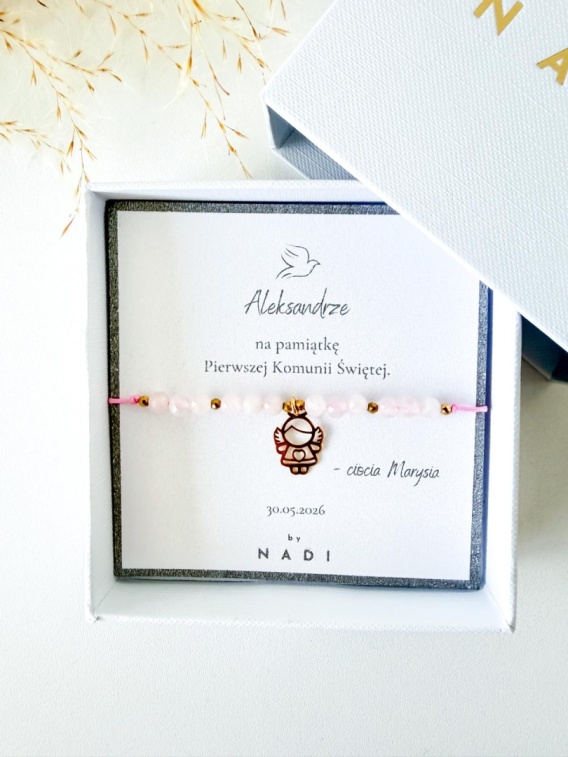 Delikatna bransoletka komunijna wykonana ręcznie z naturalnych kamieni. Symboliczna pamiątka Pierwszej Komunii Świętej z możliwością personalizacji dedykacji.