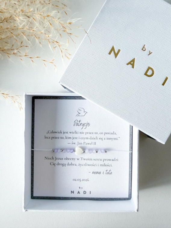 Delikatna bransoletka komunijna wykonana ręcznie z naturalnych kamieni. Symboliczna pamiątka Pierwszej Komunii Świętej jak i Bierzmowania z możliwością personalizacji dedykacji.