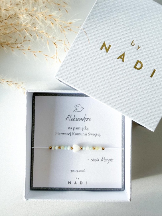 Delikatna bransoletka komunijna wykonana ręcznie z naturalnych kamieni. Symboliczna pamiątka Pierwszej Komunii Świętej jak i Bierzmowania z możliwością personalizacji dedykacji.