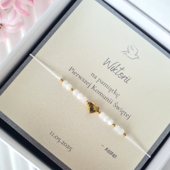 Największym wyjątkiem tej bransoletki jest serduszko wykonane z hematytu. To delikatne serduszko jest symbolem miłości, która towarzyszy w każdej chwili życia, a także miłości Boga, centralnego punktu Pierwszej Komunii Świętej.