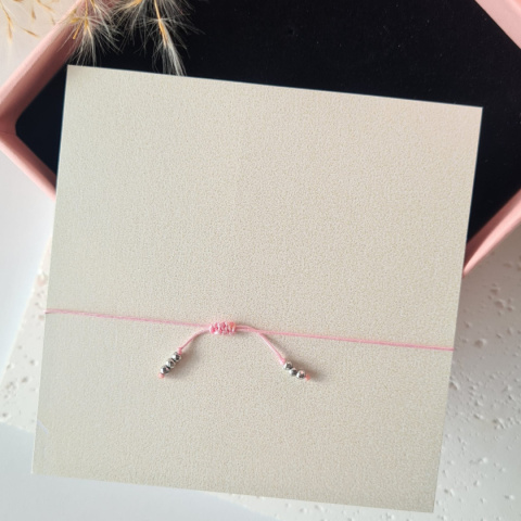 Bransoletka posiada regulowany sznurek w kolorze pastelowego różu, dzięki czemu można ją łatwo dopasować do nadgarstka.