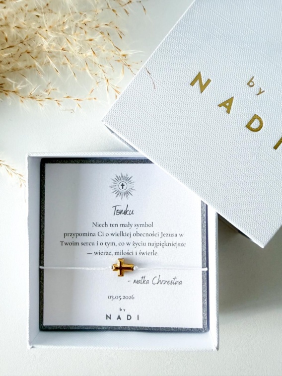 Bransoletka zapakowana jest w eleganckie białe pudełko z kartą dedykacyjną, co czyni ją gotowym prezentem na Komunię Świętą.