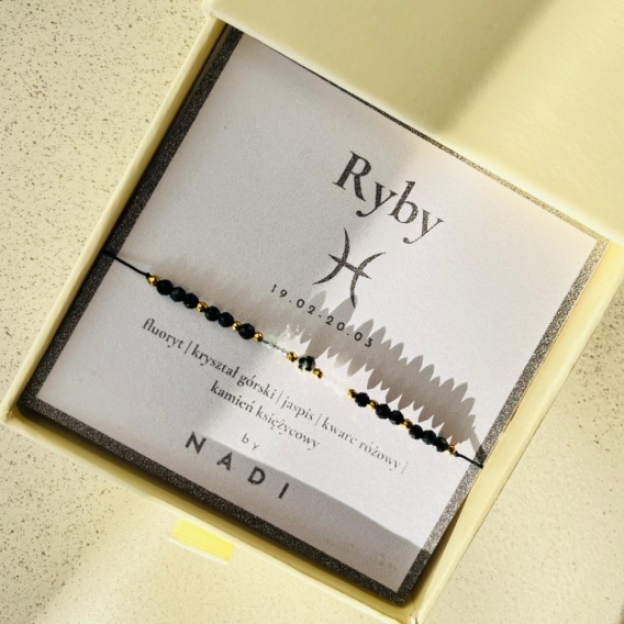 Bransoletka zodiakalna dla Ryb z fluorytu, kryształu górskiego, jaspisu, kwarcu różowego i kamienia księżycowego to talizman intuicji, miłości i wewnętrznej harmonii. Ręcznie wykonana na czarnym, regulowanym sznurku z makramą i wykończona złotymi hematytami – delikatna, kobieca i pełna duchowego blasku. Idealna dla wrażliwych i empatycznych dusz spod znaku Ryb.