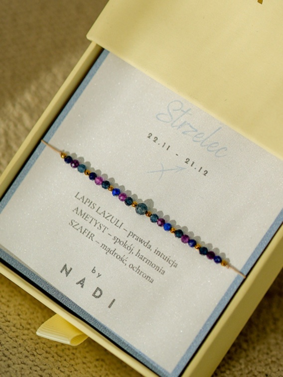 Bransoletka zodiakalna dla Strzelca z lapis lazuli, ametystu i szafiru – symbol mądrości, harmonii i intuicji. Ręcznie wykonana z naturalnych kamieni i złotych hematytów, subtelna i elegancka. Idealny talizman dla kobiet spod znaku Strzelca.