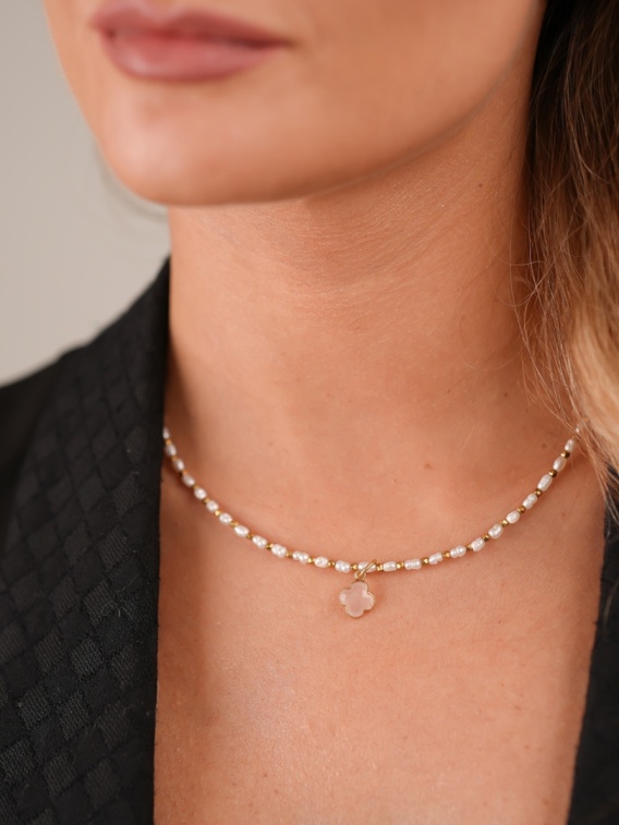 Naszyjnik otula szyję drobnymi, kremowymi perełkami naturalnymi, które pięknie odbijają światło, dodając twarzy blasku. Pomiędzy nimi połyskują złote akcenty hematytu, nadając całości delikatnego, biżuteryjnego rytmu. Centralnym elementem jest zawieszka – czterolistna koniczynka z kwarcu różowego oprawiona w złoto, która wprowadza aurę spokoju, miłości i kobiecej delikatności.To model wyjątkowo subtelny, a jednocześnie niezwykle elegancki. Doskonały na co dzień, do pracy, na wyjątkowe okazje — ale także jako symboliczny prezent dla bliskiej osoby.