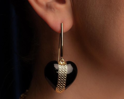 Pozłacane, ręcznie malowane na czarno kolczyki serca . Długość kolczyka ok 6 cm.
