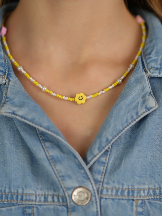 Wykonany z koralików w pastelowych odcieniach w kolorze biało-żółtym oraz srebra, emanuje radością i urokiem dziecięcej niewinności. Ozdobione pięknymi kwiatuszkami, które dodają mu subtelnego uroku i dziewczęcego wdzięku. Jest to idealny naszyjnik dla młodej damy, która kocha bawić się modą i wyrażać swoją indywidualność w sposób delikatny i elegancki.