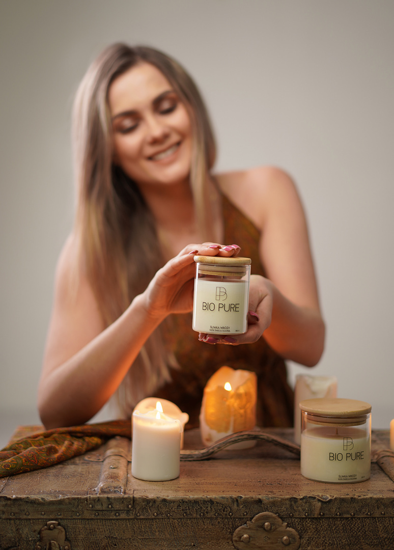 Świece oferowane przez sklep BIO-PURE palą się dłużej od tradycyjnych, dzięki niższej temperaturze topnienia wosku sojowego. Ich zapach jest intensywniejszy i dłużej utrzymuje się w pomieszczeniu.