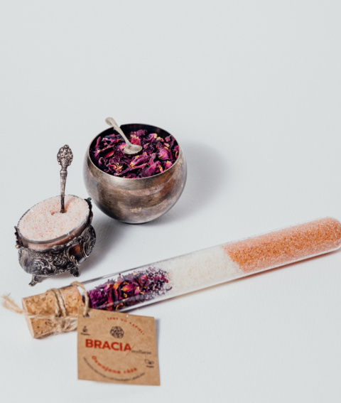 Skład: Sól himalajska drobnoziarnista, sól z morza martwego, gomfrena kulista, płatki róży, esencja zapachowa, **potencjalne alergeny