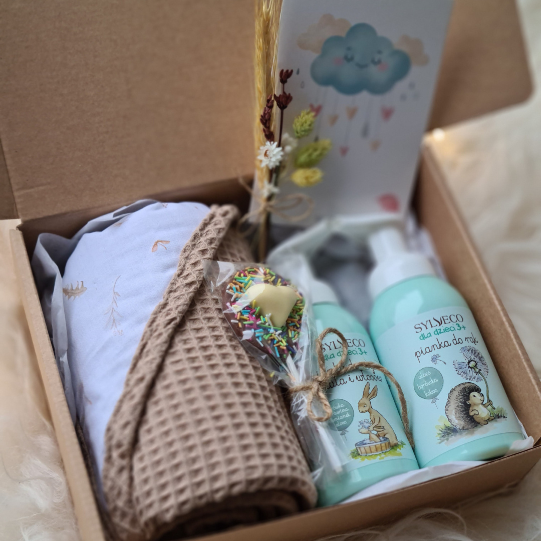 Jest to gotowe pudełko na prezent, które zostało stworzone z sercem, z naturalnych i najwyższej jakości produktów. Idealnie posłuży jako prezent np. na Narodziny maluszka, Baby Shower, Chrzciny...